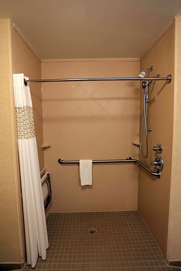 This mobility and hearing accessible, non-smoking room features one king-sized bed, and an accessible roll-in shower. The room also has a visual alarm and notification devices for the doorbell or door knock and incoming phone calls. The room features comfortable soft seating, microwave, refrigerator, a HDTV, and easy to operate alarm clock/radio. The free WiFi access will help you stay connected while on the road. If you prefer not to work at the desk, you can use the convenient lapdesk instead. You'll also enjoy the convenience of having a coffeemaker with tea service and iron/ironing board in your room. Any corresponding photo may not reflect the specific accessible room type or room feature.