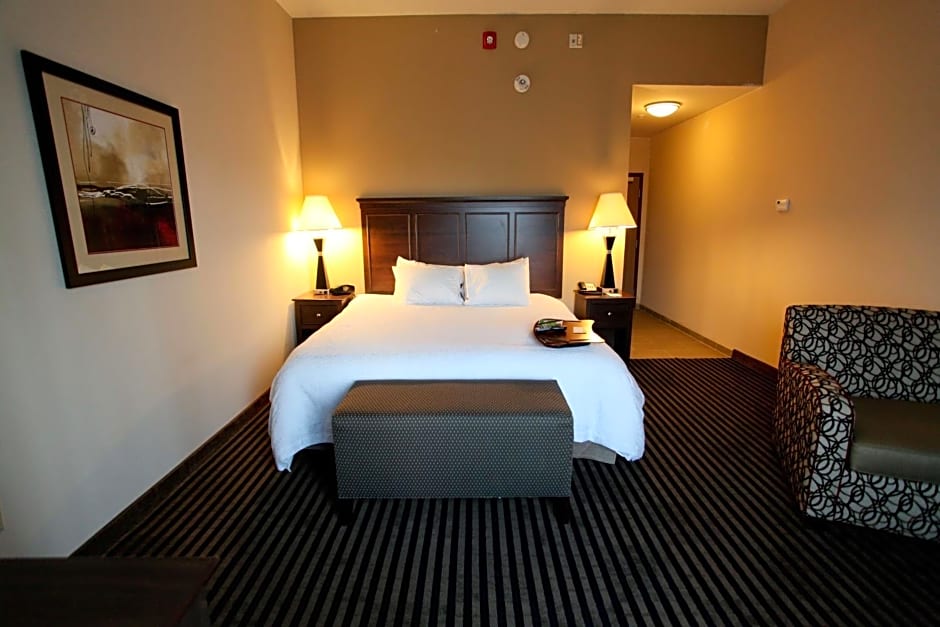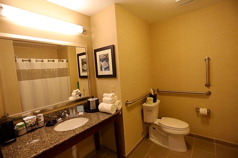 This spacious hearing-impaired-equipped, non-smoking room features a king-sized bed with our clean and fresh Hampton bed, comfortable soft seating, 32-inch LCD HDTV, micro-fridge, and easy to operate alarm clock/radio. The free WiFi access will help you stay connected while on the road. If you prefer not to work at the desk, you can use the convenient lapdesk instead. You'll also enjoy the convenience of having a coffeemaker with tea service and iron/ironing board in your room. In the bathroom you will enjoy our large dressing area with fluffy towels, WaterPik showerhead and sliding shower doors that allows more light and space in the shower. Any corresponding photo may not reflect the specific accessible room type or room feature.