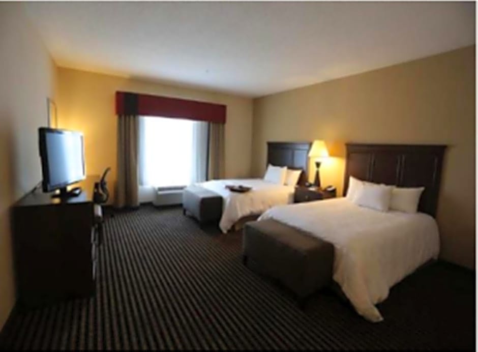 This hearing accessible, non-smoking room features two queen-sized beds. The room also has a visual alarm and notification devices for the doorbell or door knock and incoming phone calls. The room features our clean and fresh Hampton bed, comfortable soft seating, microwave, refrigerator, a HDTV, and easy to operate alarm clock/radio. In the bath you will enjoy a WaterPik showerhead and curved shower rod. The free WiFi access will help you stay connected while on the road. If you prefer not to work at the desk, you can use the convenient lapdesk instead. You'll also enjoy the convenience of having a coffeemaker with tea service and iron/ironing board in your room. Any corresponding photo may not reflect the specific accessible room type or room feature.